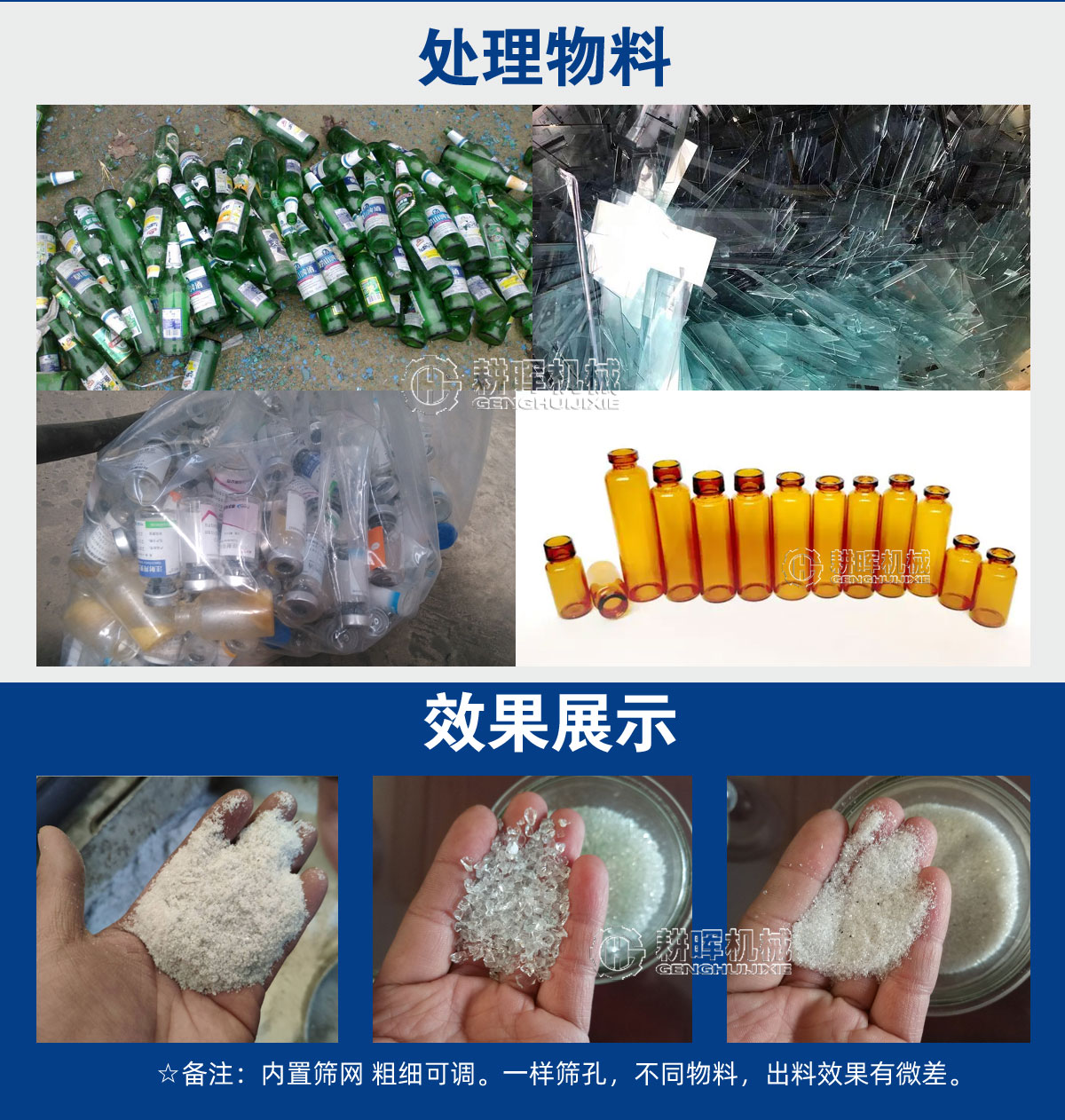 將玻璃瓶、酒瓶、鋼化玻璃等玻璃制品粉碎至指定粒度。